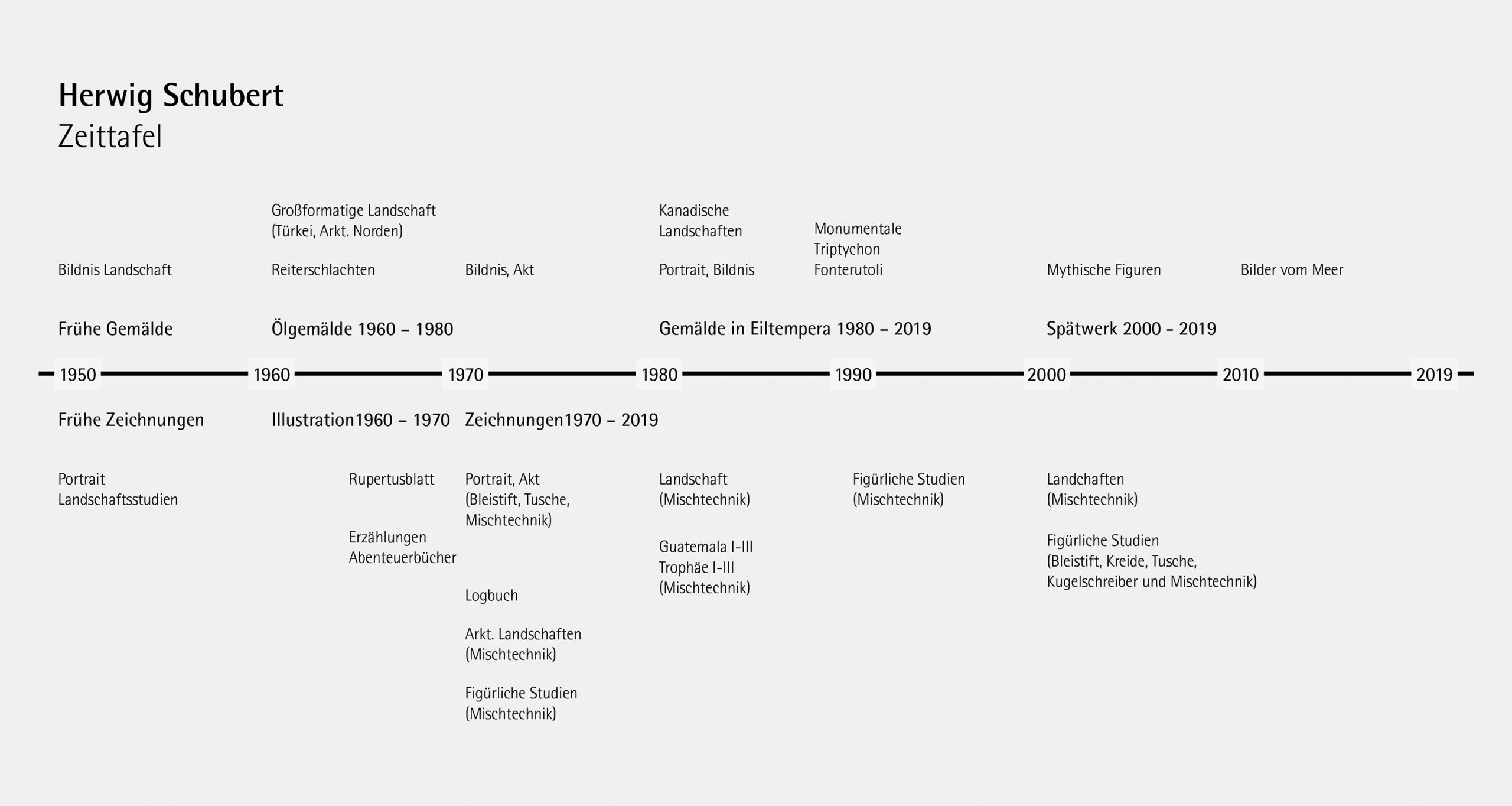 Um das Werk von Herwig Schubert zu erfassen, bedarf es einer chronologischen Betrachtung seiner Gemälde, Zeichnungen und Illustrationen. Dadurch wird deutlich, in welchem Maße Thematik, künstlerische Techniken, Gattungen und Stilelemente in den verschiedenen Schaffensphasen mit der Persönlichkeit des Künstlers verbunden sind. Zudem kann durch den Vergleich und die Zusammenschau der verschiedenen Gattungen und Arbeitsphasen die Entwicklung seines Werkes und die kontinuierliche Vertiefung und Intensivierung seines künstlerischen Ausdrucks erschlossen werden.